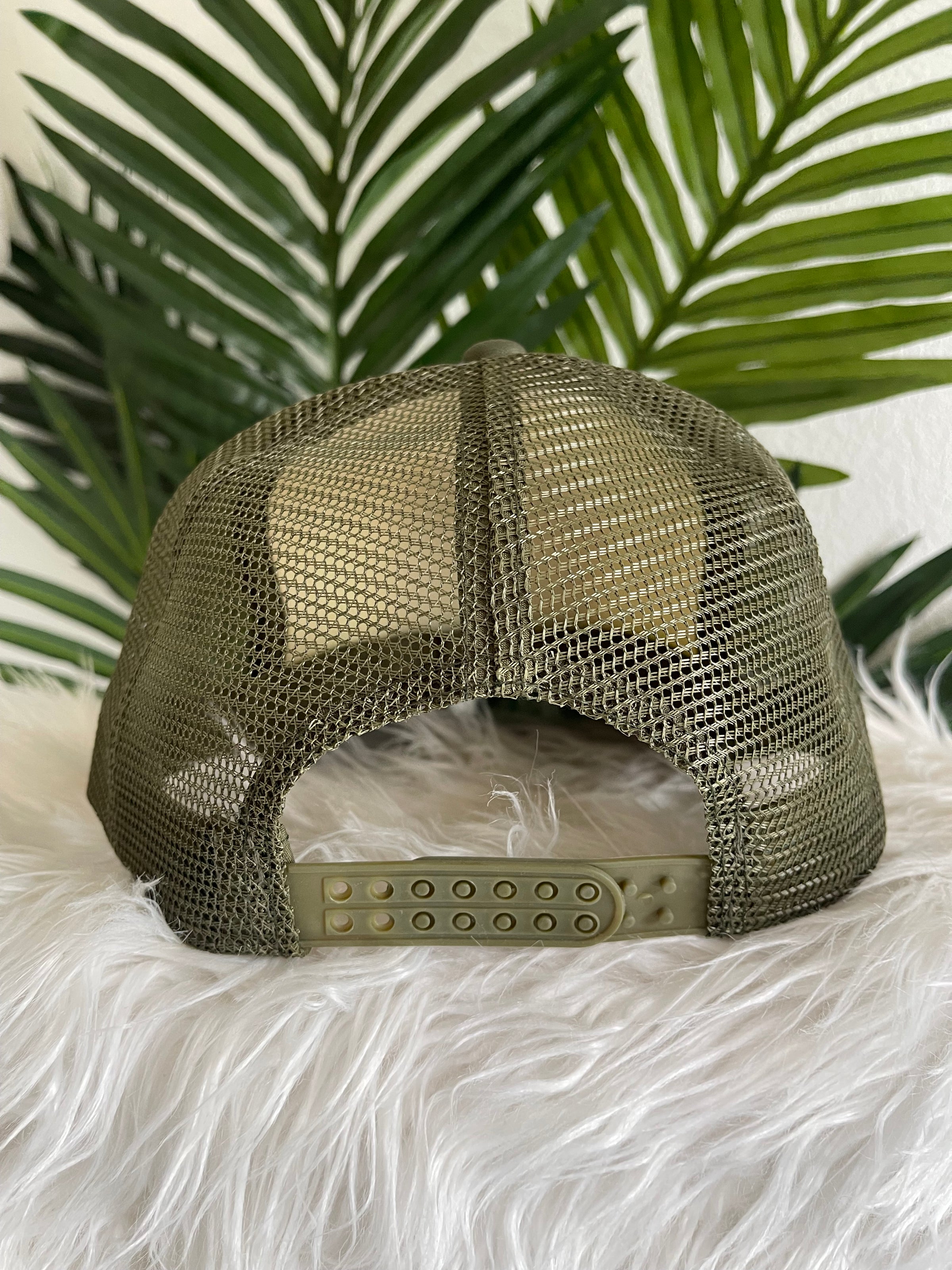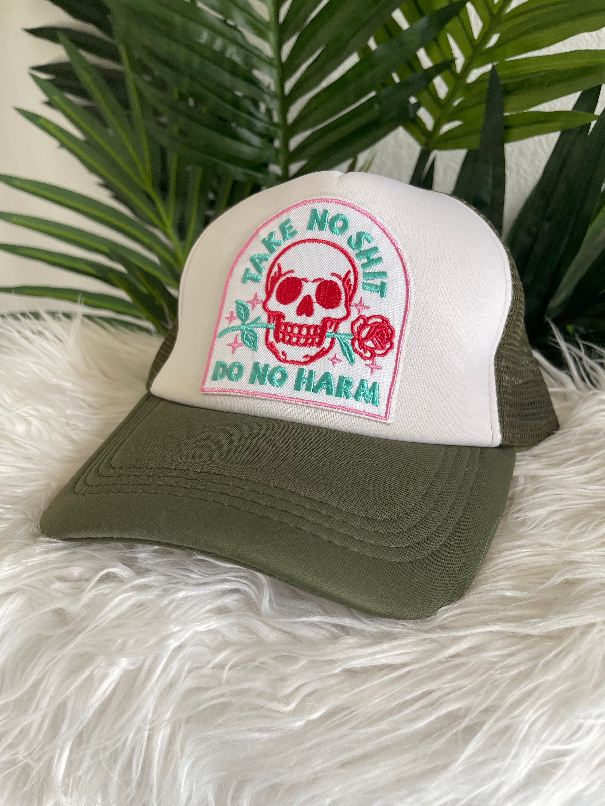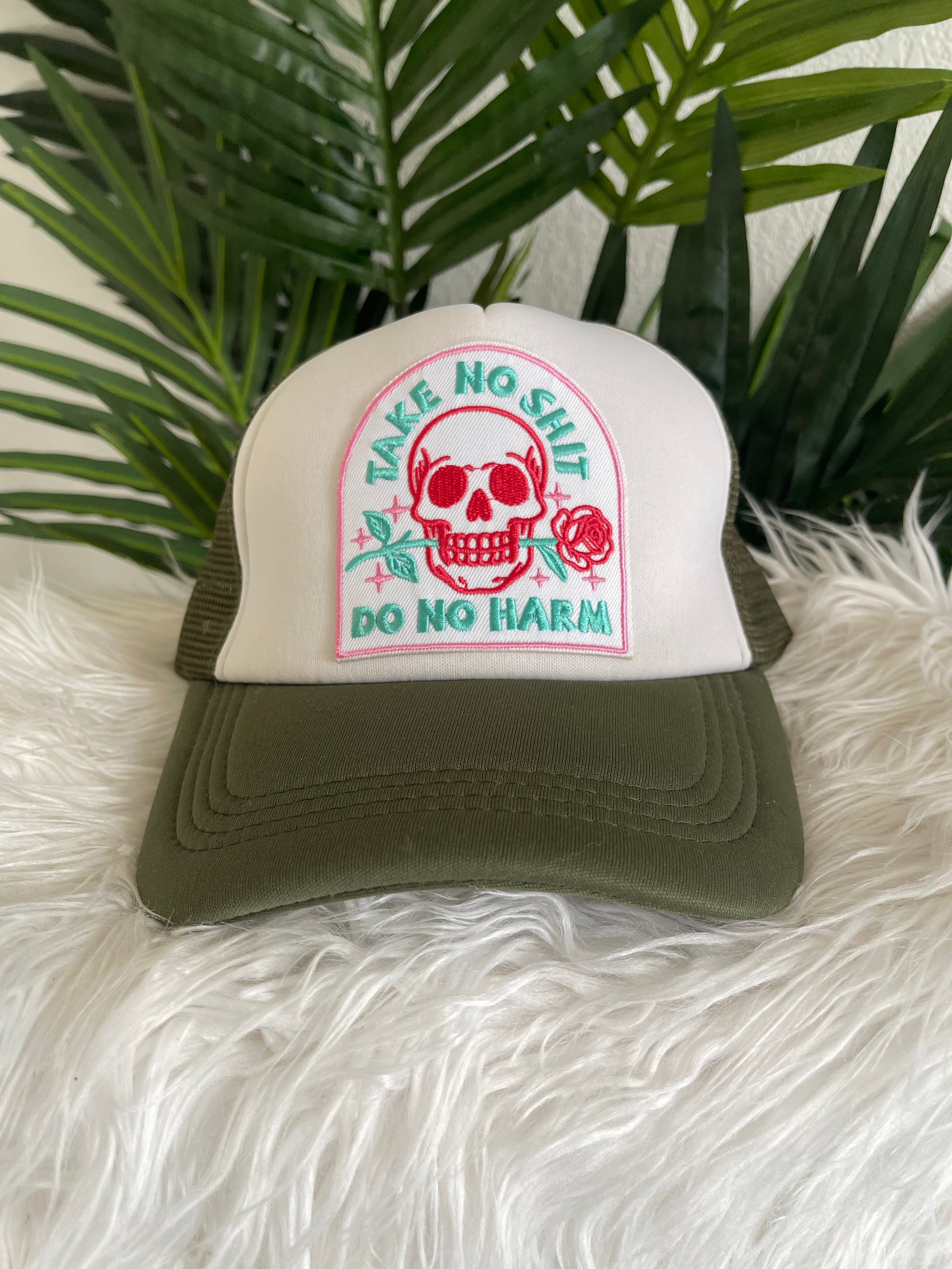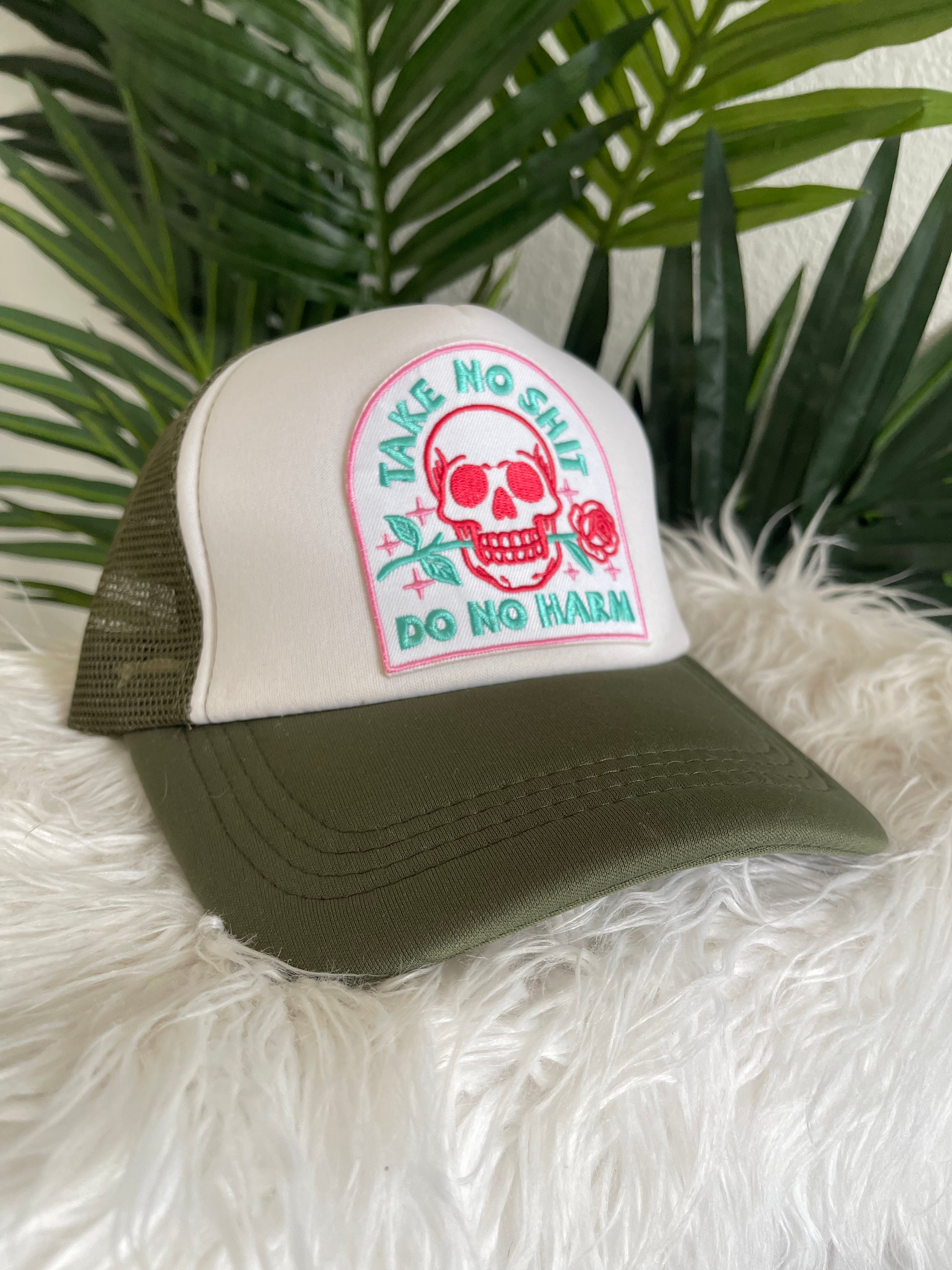 This is a one size fits most trucker hat. The back is mesh and breathable and it has an adjustable snap backing. It has "take no shit - do no harm" cute, colorful patch on the front with a big skull in the middle. Hat is an olive green+white color combo. A little cuteness with a ton of sass.
