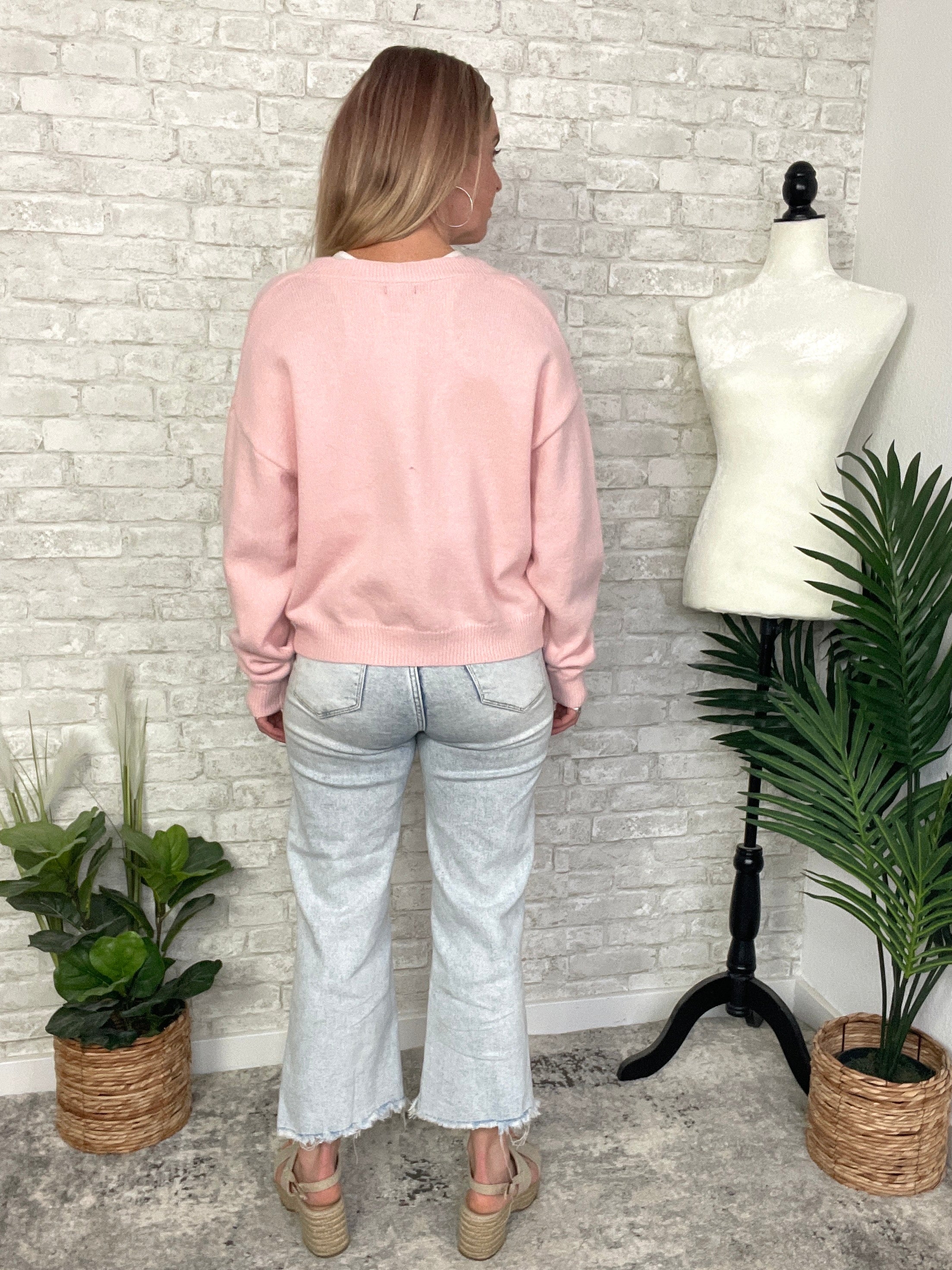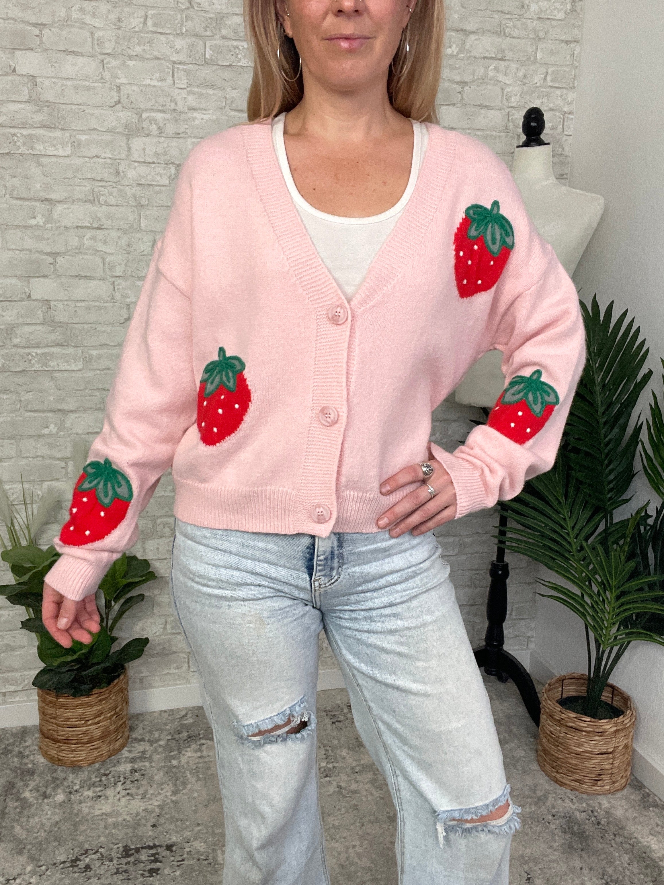 *Medium weight pink cardigan with large raised strawberries printed on it
