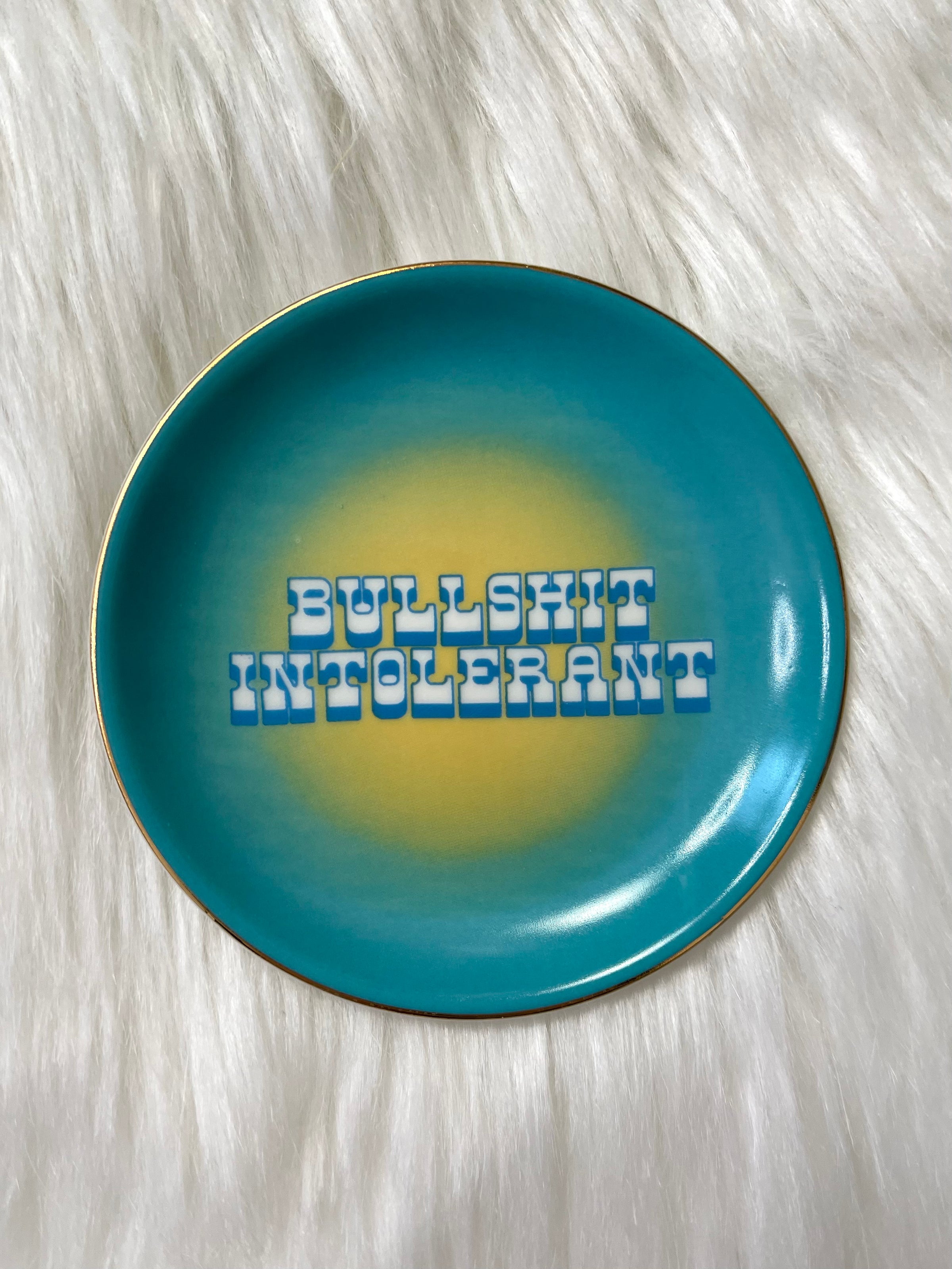 This jewelry tray is a cute way to hold jewelry, important little things or use as a cute decor piece. This tray is a teal color with a fade to yellow in the center, it says "bullshit intolerant" in the center and there is a gold trim around the outside of the dish. Perfect amount of sass! Dimensions are approximately: 4" diameter (organic round) x 0.5" high