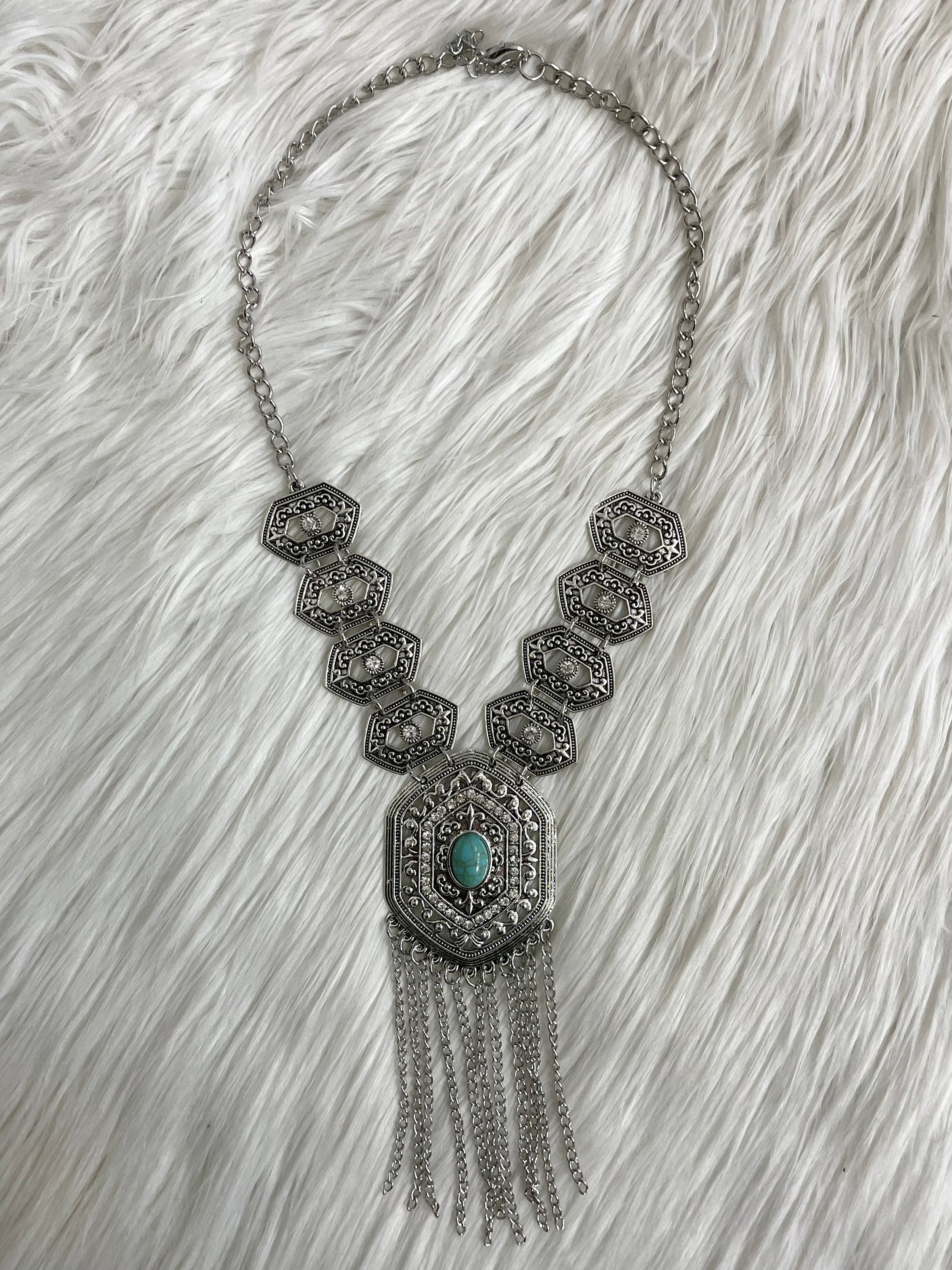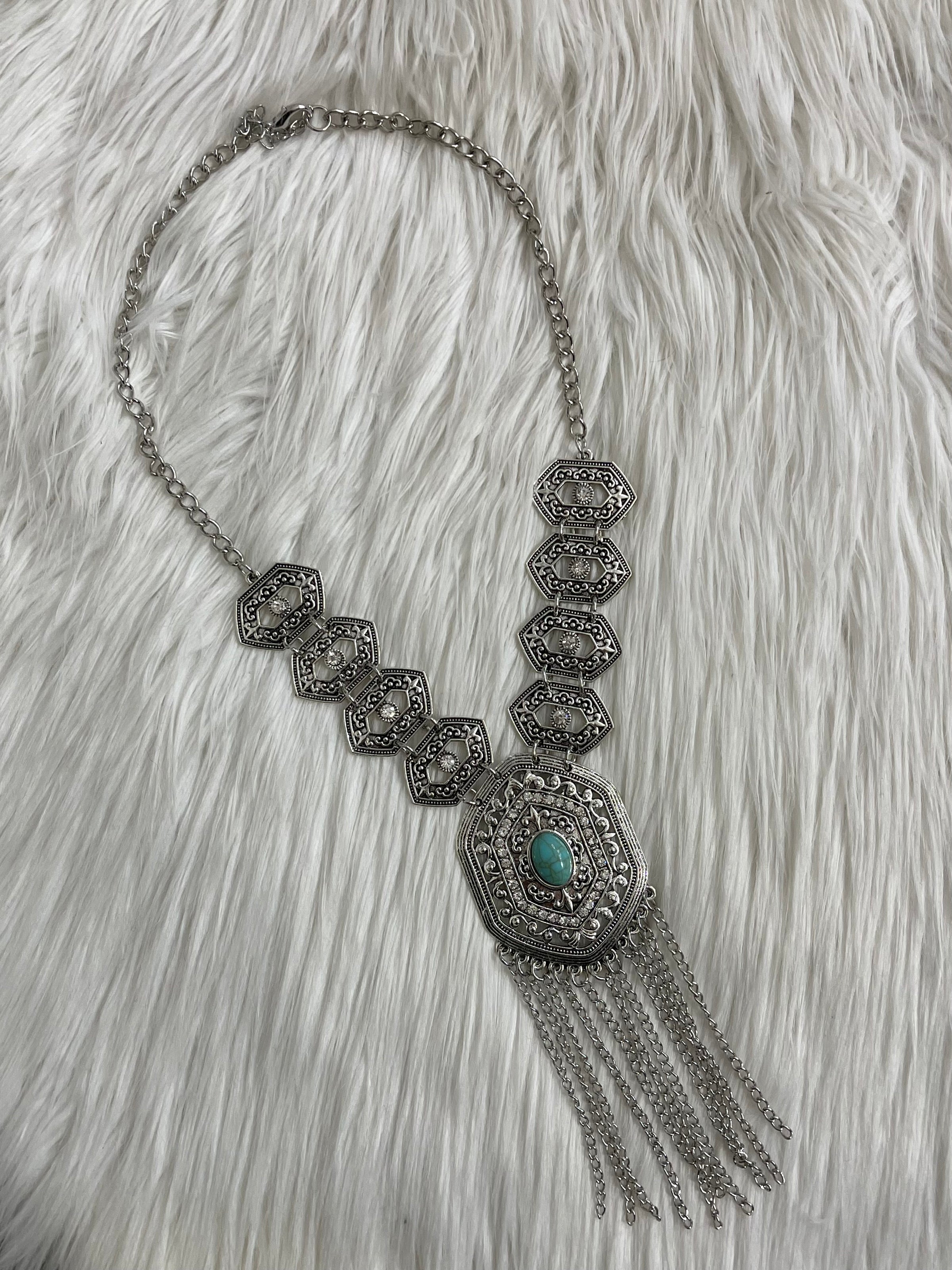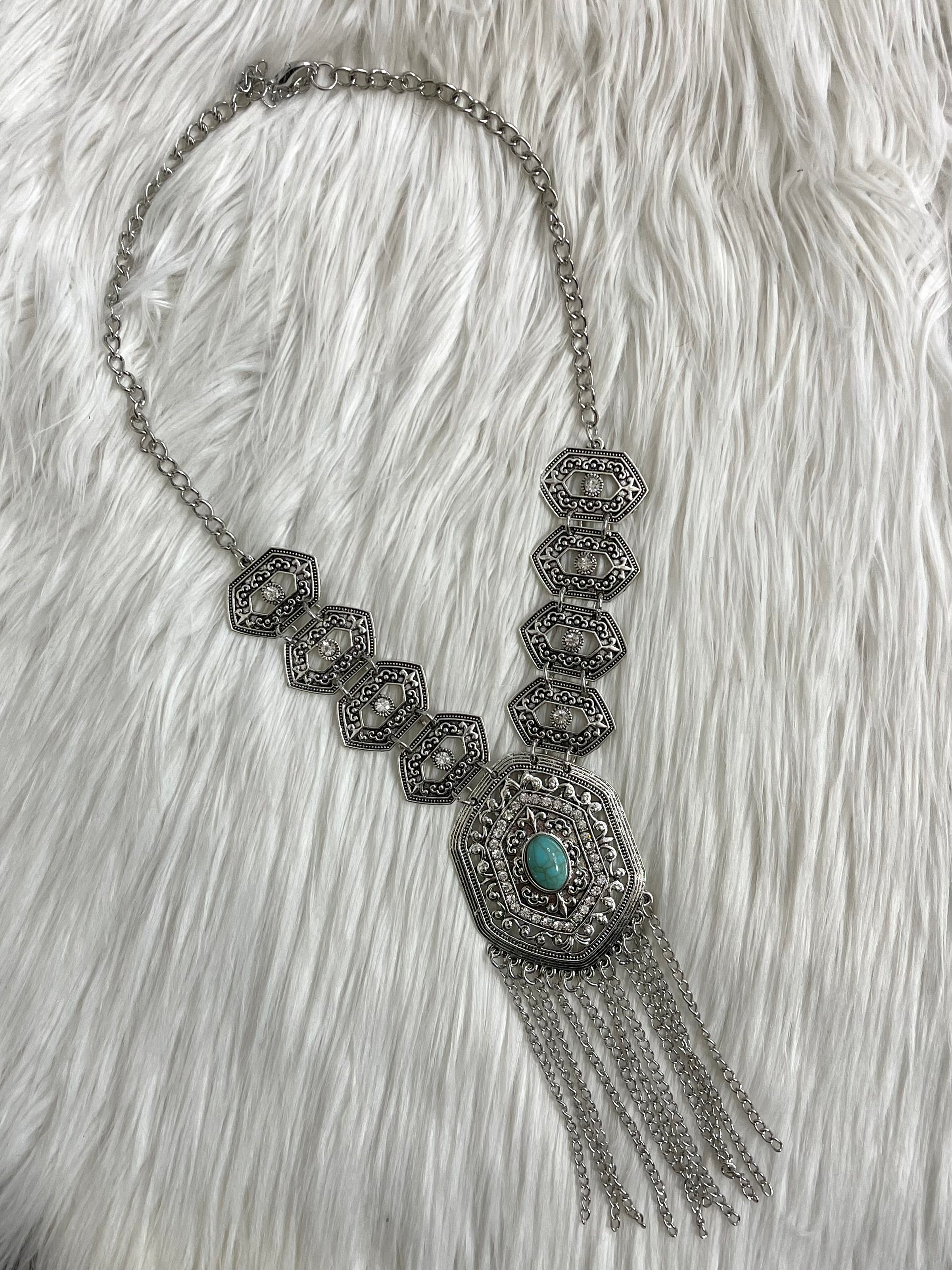*Silver metal + turquoise + rhinestone details with chain tassels
