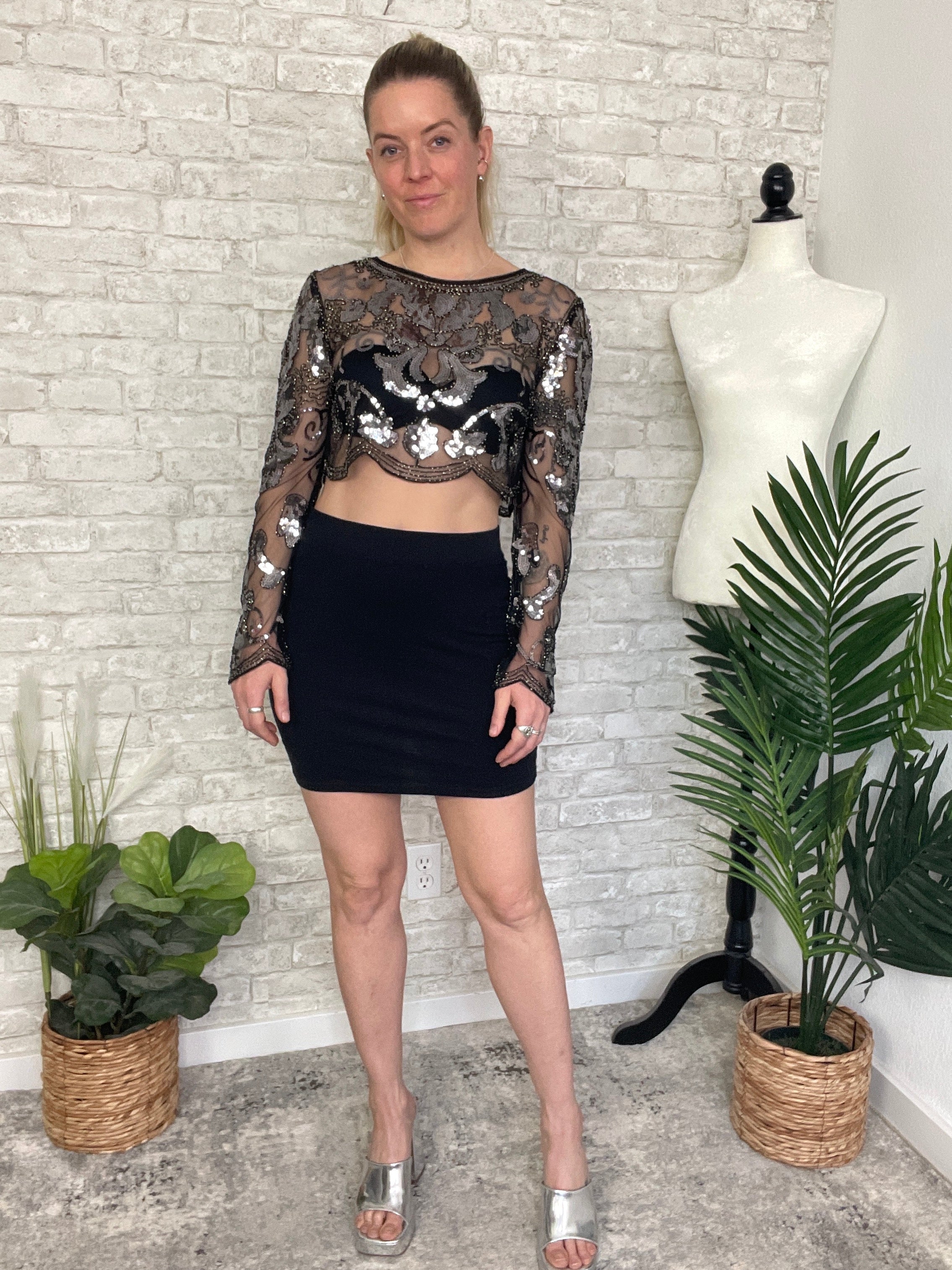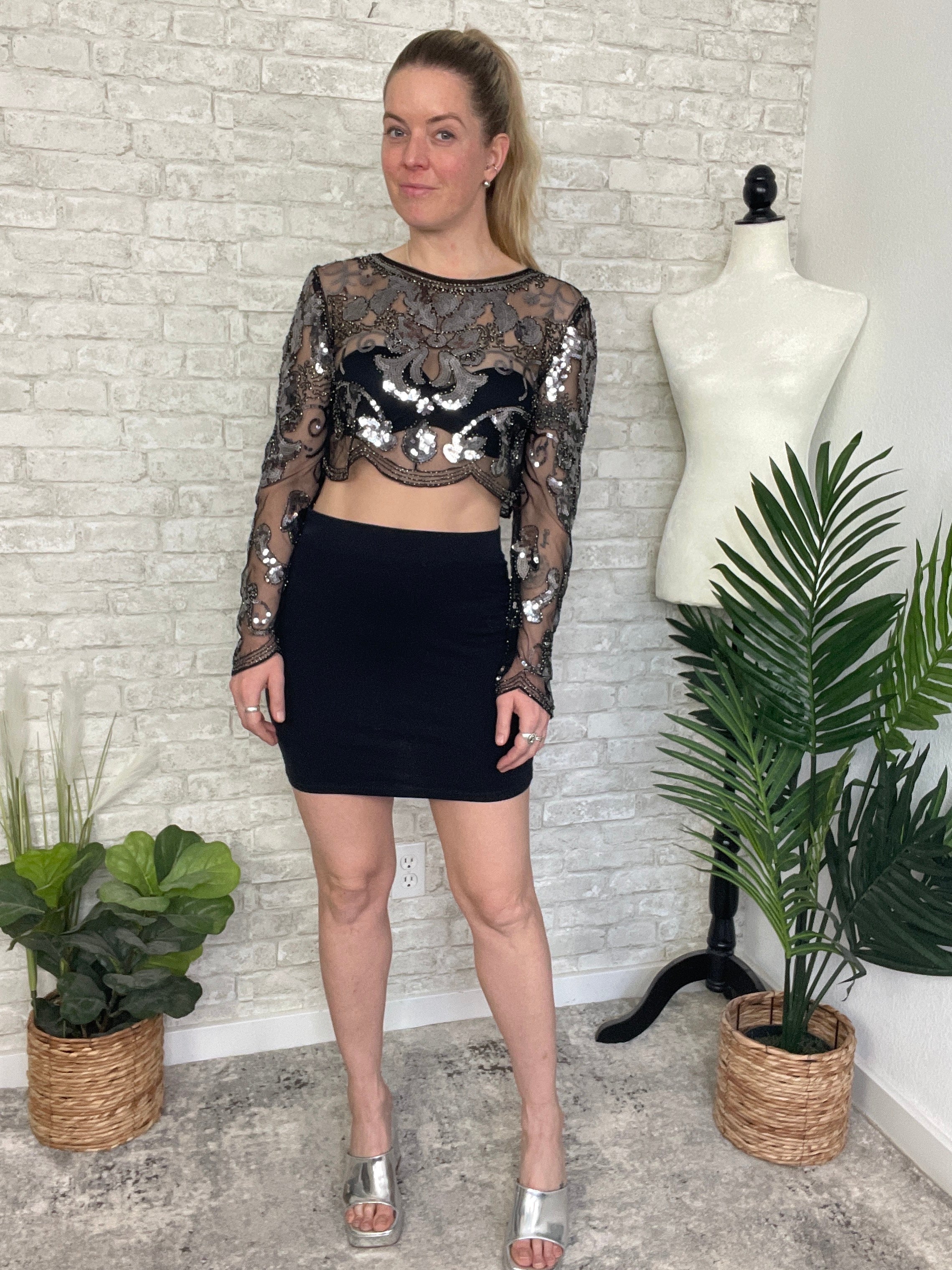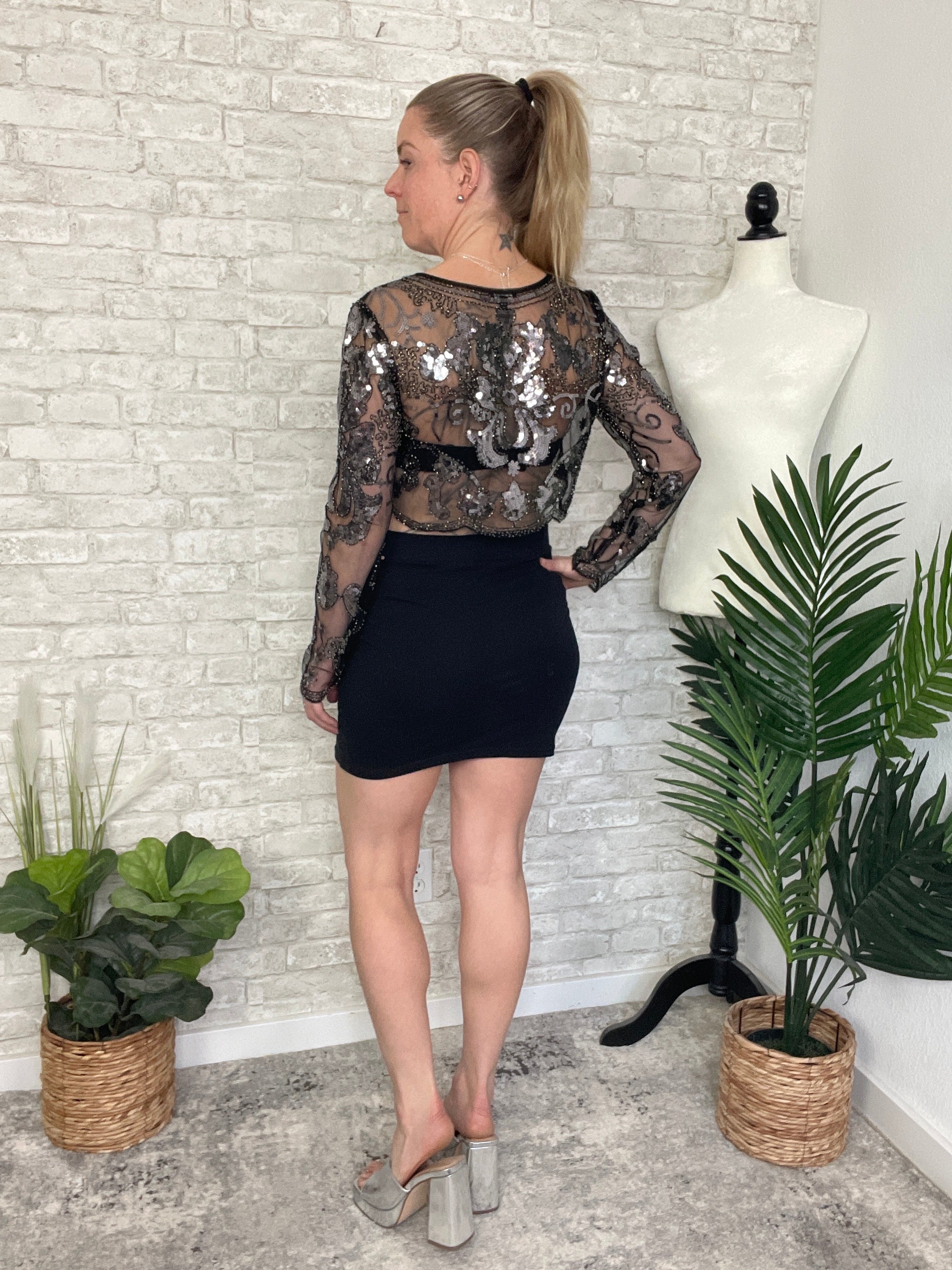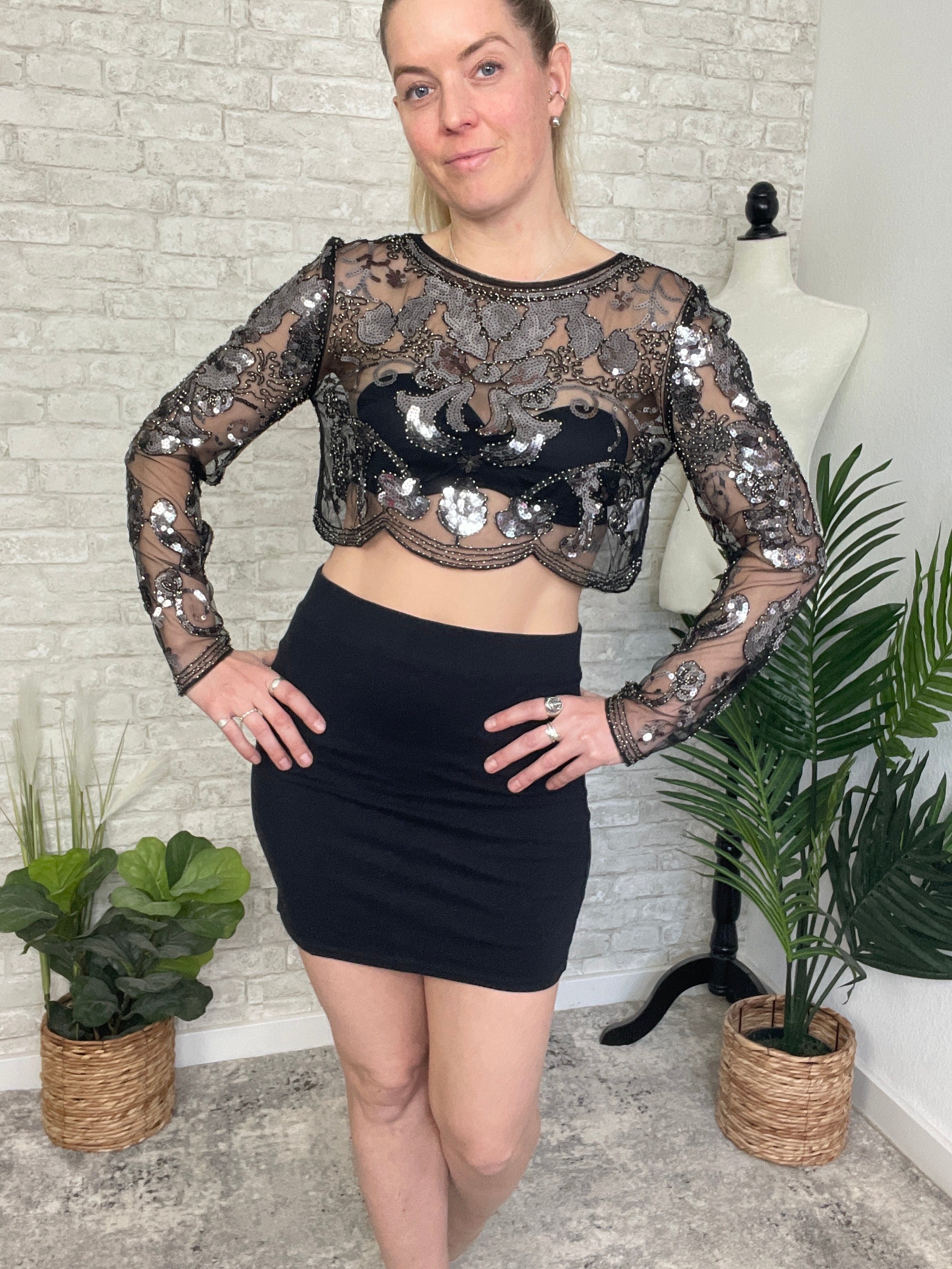 *Black mesh with a beautiful vintage inspired sequin design, hem on the sleeve and the shirt is scalloped and shaped