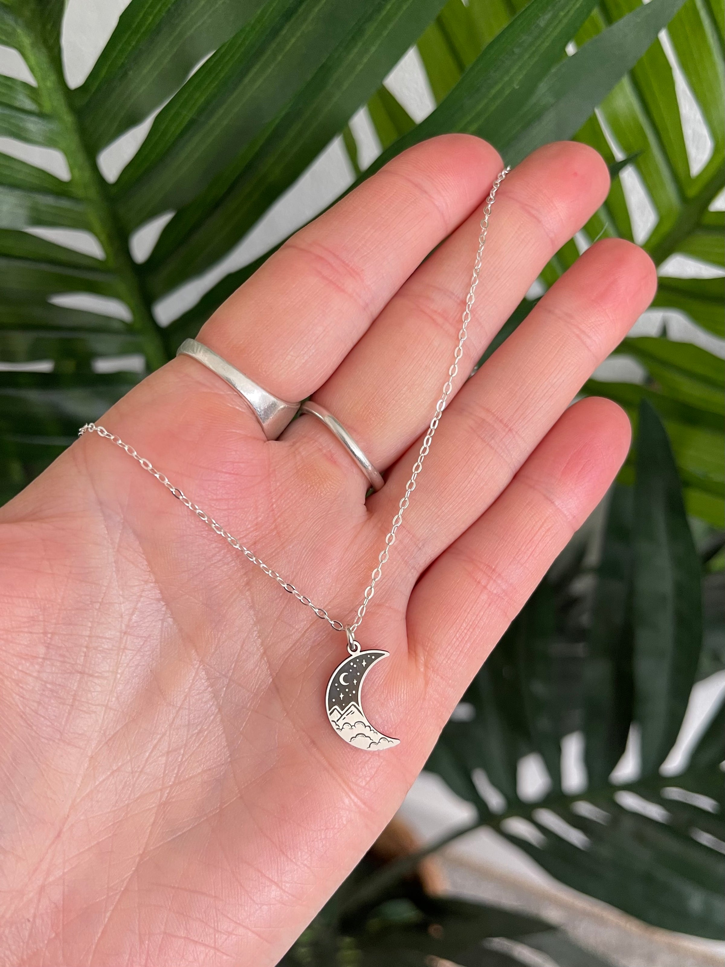 Handmade in Utah! This little necklace is sterling silver and great on it's own or for layering with other pieces! The chain has two options for length. It can be worn at 16" long or has an extender to be worn at 18" long. The measurements of the mini night sky pendant are 0.5625" X .25”!