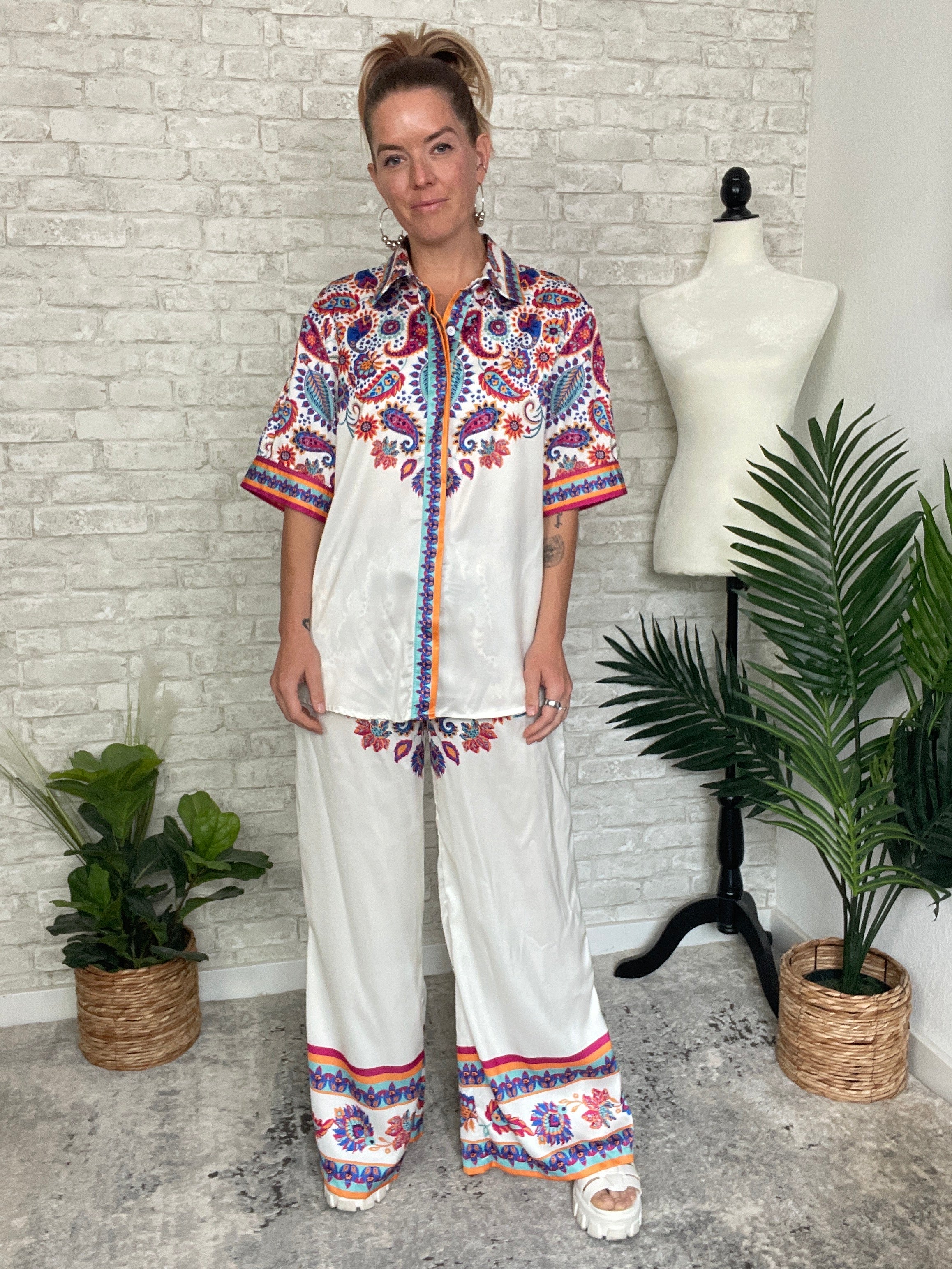 *Fun bohemian + colorful paisley print that fades from the top to plain white on the bottom of the shirt